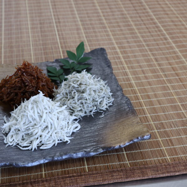 しらす本来の味をご堪能いただける「釜揚げしらす」、天日製法にこだわり干し上げる「ちりめんじゃこ」、生しらすを柔らかく煮詰めた「しらす釘煮」をご家庭用にパック詰めで、ギフト用に箱詰めで提供しております。(大五水産)